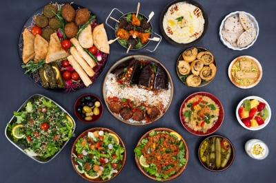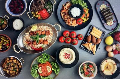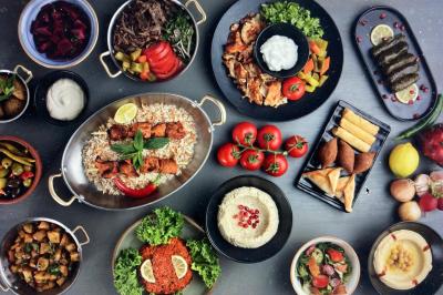 Houmous, caviar d’aubergine, salade boulghour, Kebbé (boulette de viande) falafel, mini brochette de poulet, beignet de viande de bœuf, beignet fromage