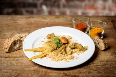 Naan/Inde : Naan au poulet tandoori grillé à la plancha, potimarron et épinard au gingembre, raïta aux oignons rouges, salade croquante accompagné d’un dahl de lentilles au citron vert et noix de coco.
