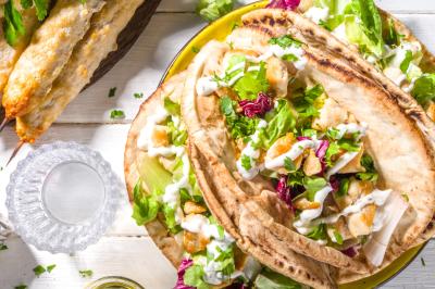 Souvláki/Grèce : Pain grec avec une brochette de poulet grillé et mariné au citron et herbes, tomates confites, olives kalamata, oignons rouges caramélisés et sauce yaourt à la menthe, accompagné de pdt au four et htipiti (sauce feta et poivrons).