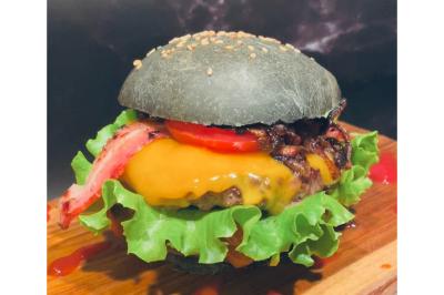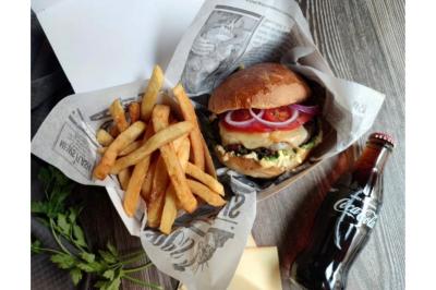 Pain artisanal, steak de Bœuf charolais, cheddar, bacon grillé, salade, tomates, oignons frits, sauce maison