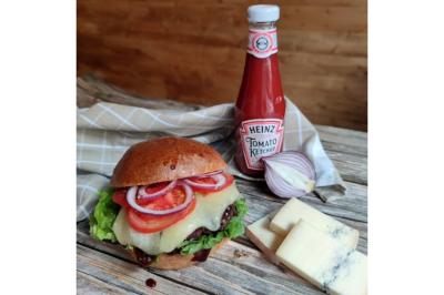 Pain artisanal, steak de Bœuf charolais, cheddar, salade, tomates, oignons frits, sauce maison