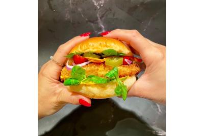 Pain artisanal, poulet mariné pané, cheddar, bacon grillé, salade, tomates, oignons rouges , sauce maison