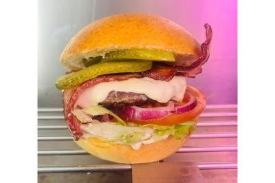 Pain artisanal, steak de bœuf charolais, double fromage à raclette fumé, bacon grillé, cornichons, salade, tomates, oignons rouges , sauce maison