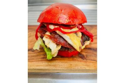 Pain artisanal, steak de bœuf charolais, brie à la truffe, Bresaola grillé, salade, pickels d’oignons rouges , sauce mayonnaise à la truffe