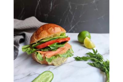 Pain artisanal, saumon fumé, salade, tomates, concombre, oignons rouges, sauce tartare maison