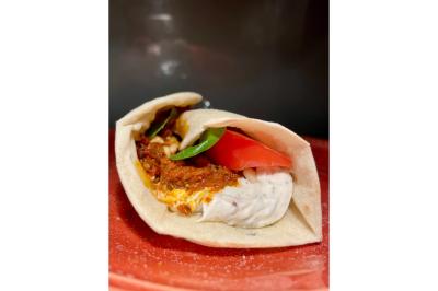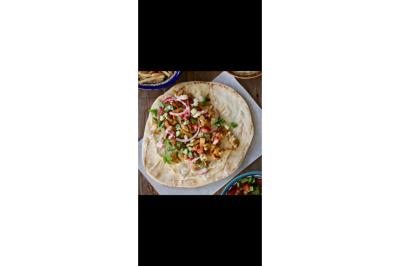 Galette libanaise, poulet mariné au zaatar et à la cannelle, pousse d’épinard, tomates, pickles d’oignons rouges, feuille de menthe, sauce blanche maison ou houmous maison